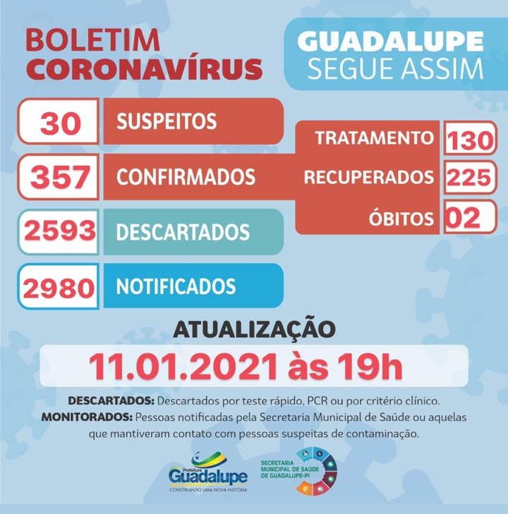 A Secretaria Municipal de Saúde, de Guadalupe-PI, divulgou na tarde desta segunda-feira 11/01, o novo Boletim Informativo quando aos casos da COVID-19.